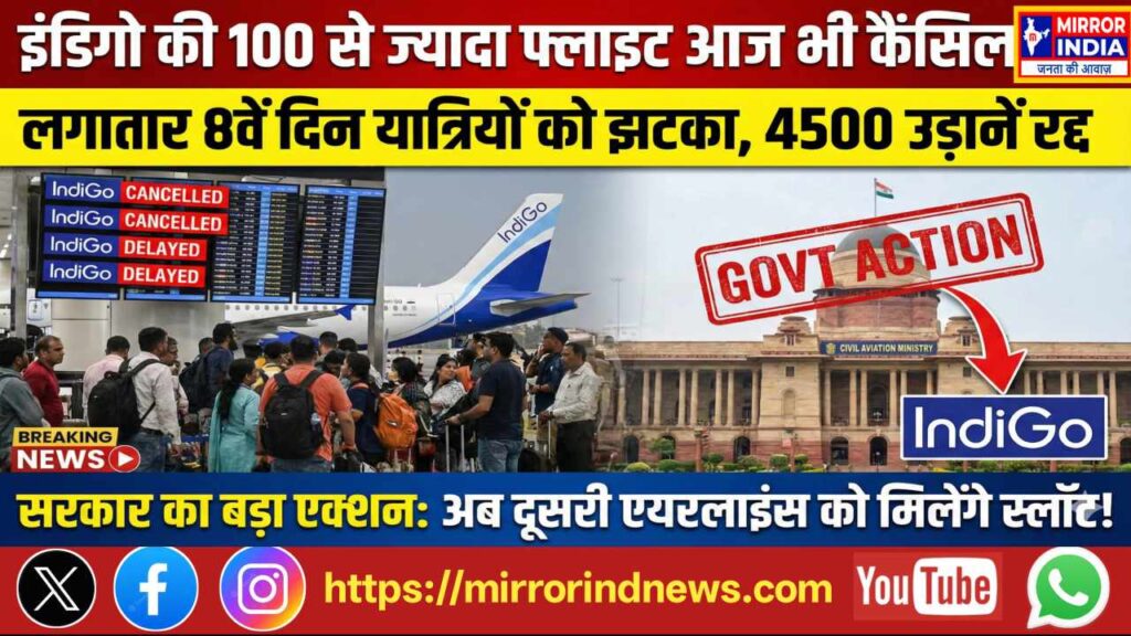 नई दिल्ली : देश की सबसे बड़ी एयरलाइन इंडिगो (IndiGo) का परिचालन संकट थमने का नाम नहीं ले रहा है। लगातार आठवें दिन यात्रियों को भारी परेशानियों का सामना करना पड़ा है। इंडिगो की वेबसाइट के अनुसार, आज (9 दिसंबर) भी 100 से ज्यादा उड़ानें रद्द कर दी गई हैं। इस बीच, लगातार हो रही लापरवाही को देखते हुए केंद्र सरकार अब एक्शन मोड में आ गई है और एयरलाइन के उड़ानों में कटौती करने की चेतावनी दी है।