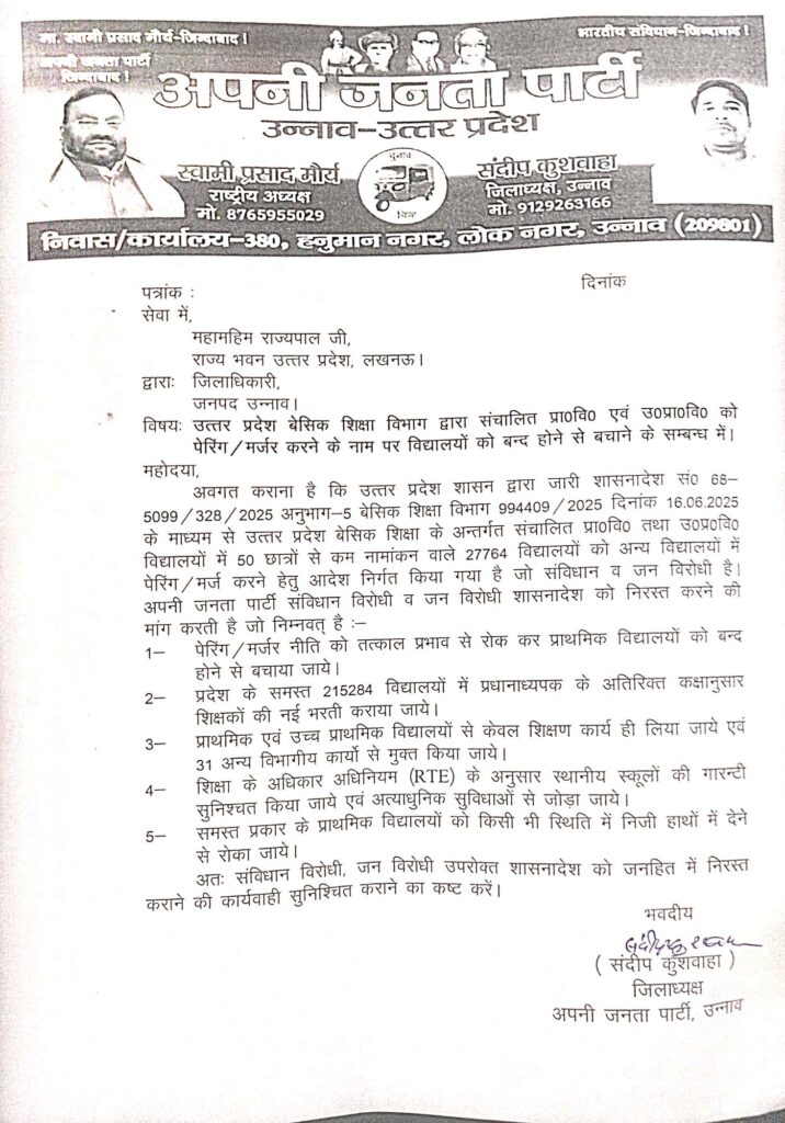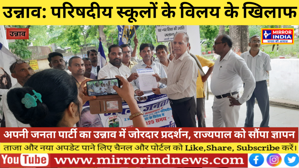उन्नाव: परिषदीय स्कूलों के विलय के खिलाफ अपनी जनता पार्टी का उन्नाव में जोरदार प्रदर्शन, राज्यपाल को सौंपा ज्ञापन
