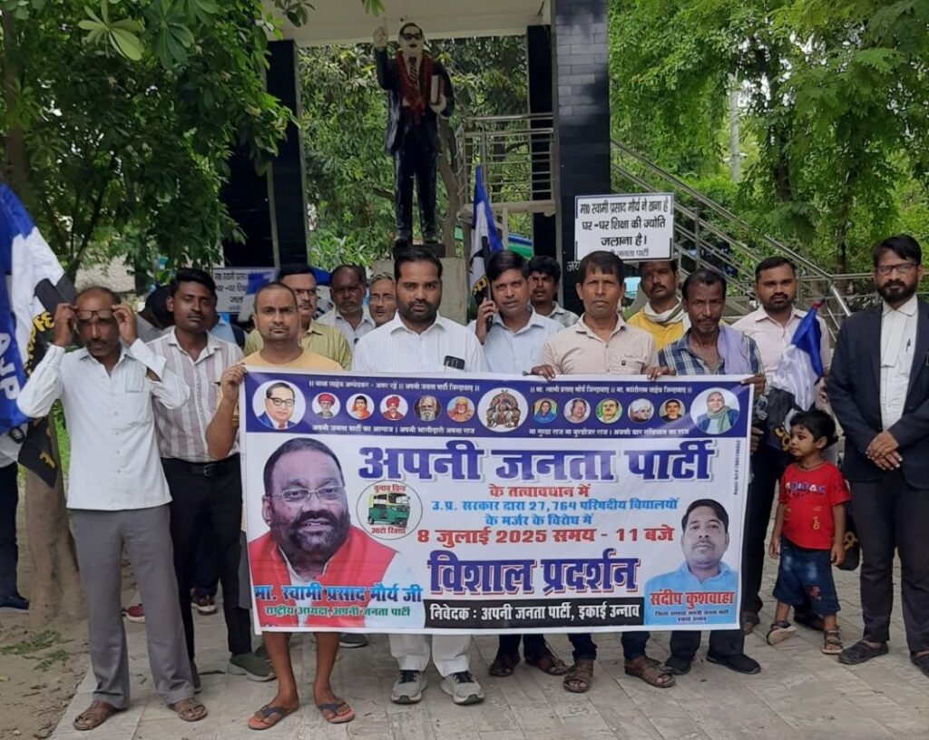उन्नाव: अपनी जनता पार्टी (एजेपी) ने प्रदेश भर में 27,764 परिषदीय स्कूलों के विलय (मर्जर) के सरकारी फैसले के खिलाफ अपनी आवाज़ बुलंद की है। इसी कड़ी में आज उन्नाव जिले में पार्टी के वरिष्ठ और लोकप्रिय नेता तथा प्रदेश सचिव श्री धुन्नी लाल मौर्य के नेतृत्व में जोरदार प्रदर्शन किया गया। प्रदर्शनकारी जिलाधिकारी कार्यालय पहुँचे और जिलाधिकारी के माध्यम से महामहिम राज्यपाल को इस जनविरोधी फैसले को वापस लेने के संबंध में एक ज्ञापन सौंपा।