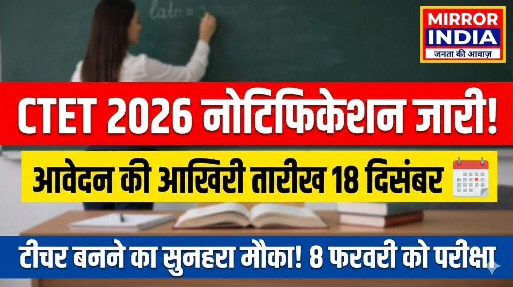 नई दिल्ली: शिक्षक बनकर देश का भविष्य संवारने का सपना देख रहे युवाओं के लिए केंद्रीय माध्यमिक शिक्षा बोर्ड (CBSE) ने बड़ी खुशखबरी दी है। सीबीएसई ने ‘सेंट्रल टीचर एलिजिबिलिटी टेस्ट’ (CTET) के फरवरी 2026 सत्र का आधिकारिक नोटिफिकेशन जारी कर दिया है। इसके लिए ऑनलाइन आवेदन की प्रक्रिया शुरू हो चुकी है। इच्छुक उम्मीदवार आधिकारिक वेबसाइट ctet.nic.in पर जाकर 18 दिसंबर 2025 तक फॉर्म भर सकते हैं।