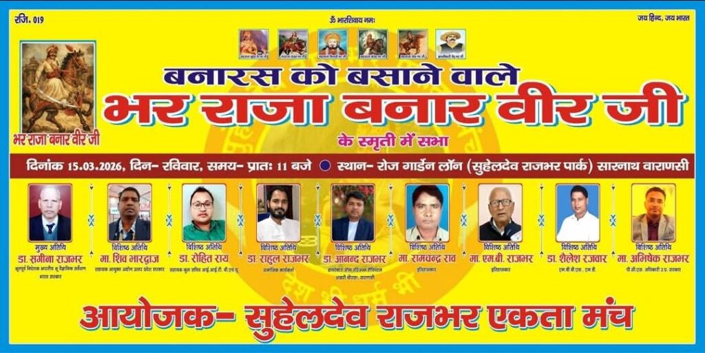 वाराणसी: 15 मार्च 2026: सारनाथ स्थित रोज गार्डन लॉन (सुहेलदेव राजभर पार्क) में आज ‘सुहेलदेव राजभर एकता मंच’ के तत्वावधान में “बनारस को बसाने वाले भर राजा बनार वीर जी” की स्मृति में एक विशाल सभा एवं संगोष्ठी का आयोजन किया गया। इस कार्यक्रम का मुख्य उद्देश्य राजभर समाज के गौरवशाली इतिहास को उजागर करना और वर्तमान सामाजिक-राजनैतिक चुनौतियों पर मंथन करना था।