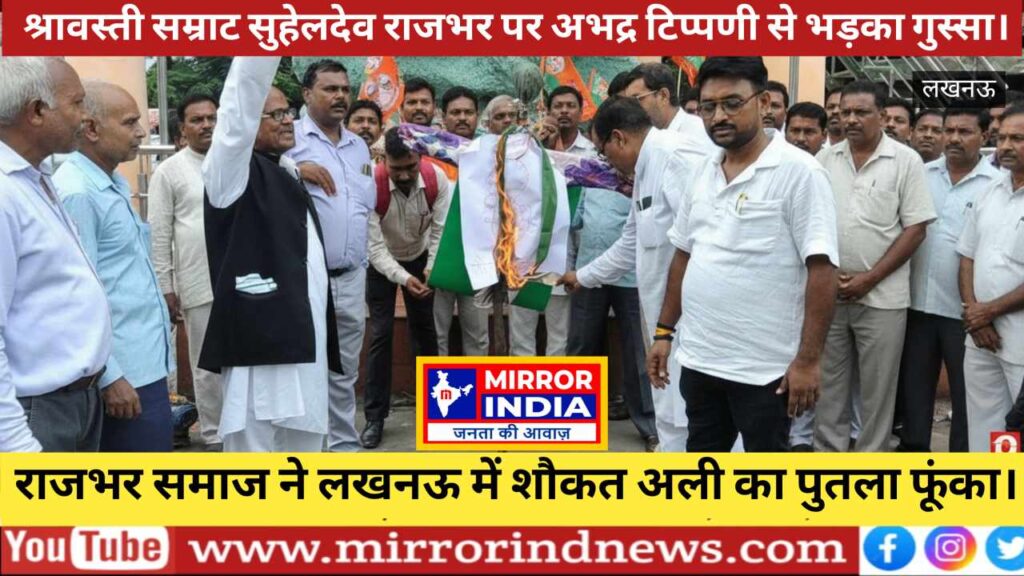 लखनऊ: श्रावस्ती के महान सम्राट महाराजा सुहेलदेव राजभर पर अभद्र टिप्पणी करना आवैशी (AIMIM) के पार्टी के प्रदेश अध्यक्ष शौकत अली को भारी पड़ गया। राजधानी लखनऊ के लालबाग स्थित सुहेलदेव राजभर चौराहा पर शनिवार को राजभर समाज के लोगों ने जोरदार विरोध प्रदर्शन करते हुए शौकत अली का पुतला दहन किया।