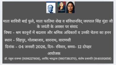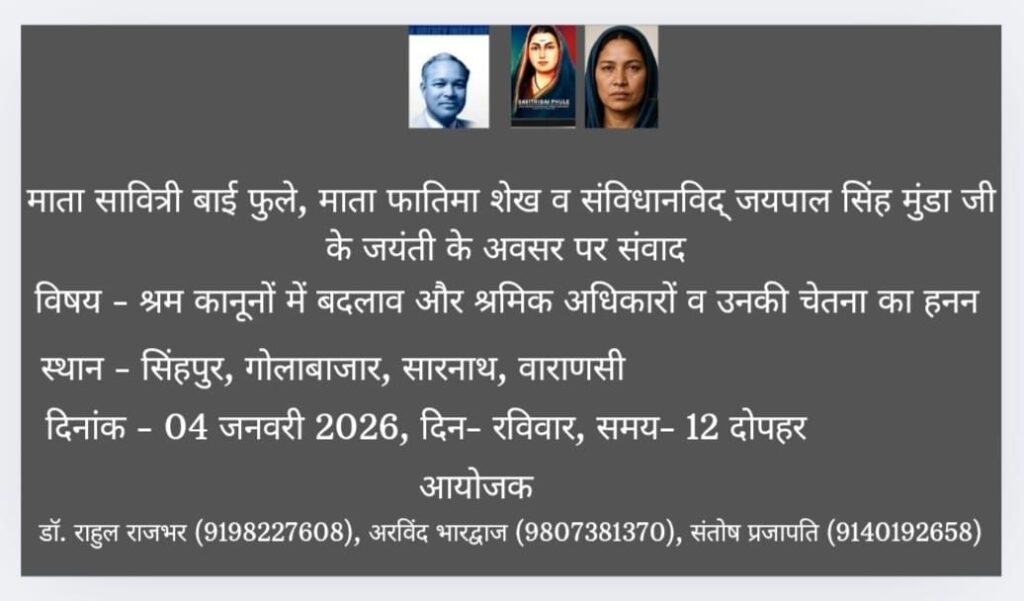 इन्हीं मुद्दों को लेकर वाराणसी के सिंहपुर, गोलाबाजार, सारनाथ में 4 जनवरी 2026 को ‘श्रम-कानूनों में बदलाव और श्रमिक अधिकारों की चेतना’ विषय पर ‘समता-संवाद’ का आयोजन किया जाएगा। यह कार्यक्रम माता सावित्रीबाई फुले, फातिमा शेख और संविधानविद जयपाल सिंह मुंडा की जयंती के अवसर पर आयोजित किया जा रहा है। आयोजन दोपहर 12 बजे शुरू होगा।