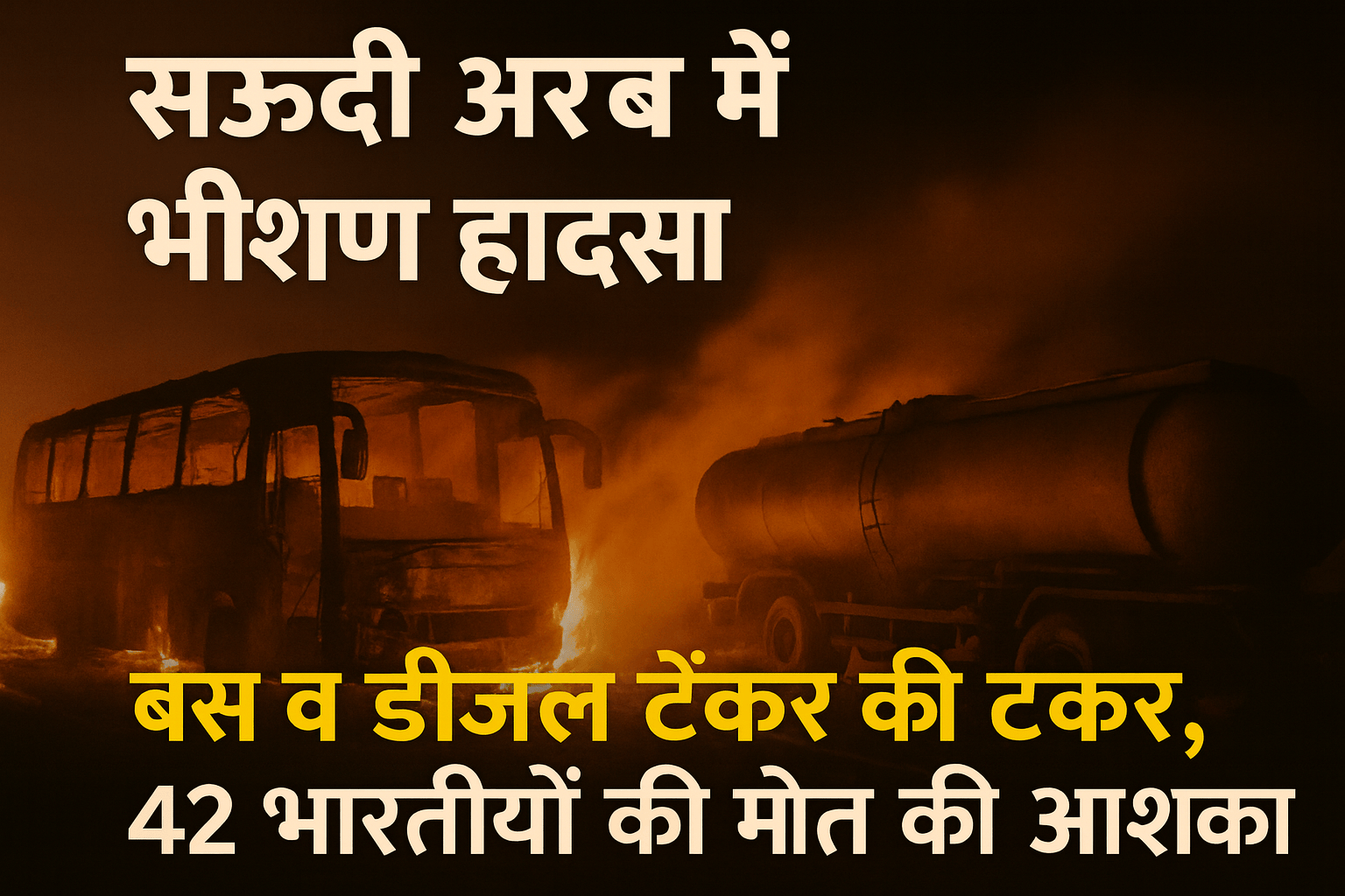 नई दिल्ली/रियाद: सऊदी अरब में सोमवार तड़के एक दिल दहला देने वाली दुर्घटना में कम से कम 42 भारतीय उमरा यात्रियों के मारे जाने की आशंका जताई जा रही है। मक्का से मदीना जा रही यात्रियों से भरी बस मदीना के पास एक डीज़ल टैंकर से टकरा गई। टक्कर इतनी भीषण थी कि कुछ ही क्षण में पूरी बस आग की लपटों में घिर गई। हादसा भारतीय समयानुसार करीब 1:30 बजे हुआ, जब अधिकांश यात्री गहरी नींद में थे।